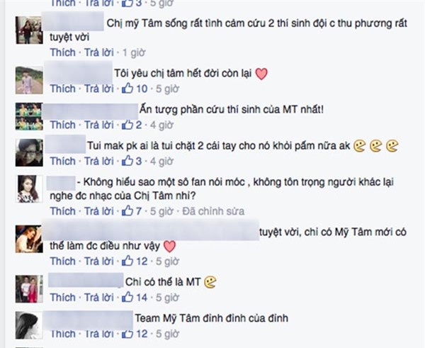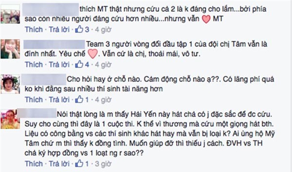 Tài khoản T.T viết: “Chị Mỹ Tâm sống rất tình cảm, cứu 2 thí sinh đội chị Thu Phương một lúc rất tuyệt vời” hay trang cá nhân của Q.L nhận định: “Ấn tượng phần cứu thí sinh của Mỹ Tâm nhất!”.