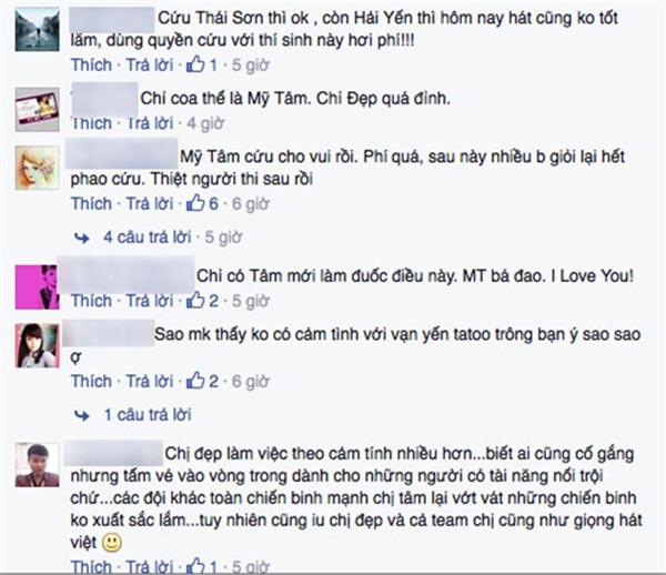 Tài khoản T.N cũng tiết nuối nhận xét: “Mỹ Tâm cứu cho vui rồi. Phí quá, sau nhiều bạn giỏi lại hết phao cứu. Thiệt người thi sau rồi…”
