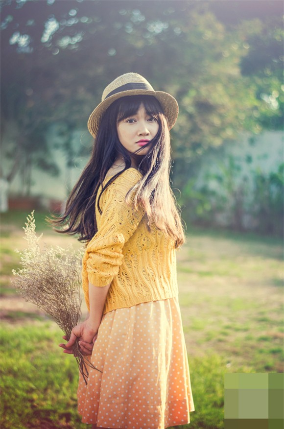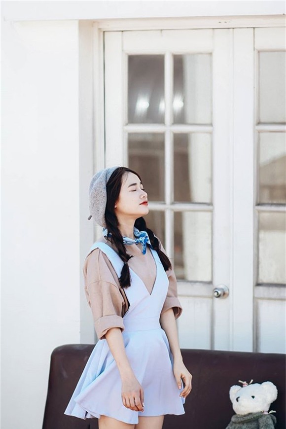 Nữ diễn viên sinh năm 1990 ngây thơ, trong sáng với lối ăn mặc giản dị và xì tin như váy chấm bi và áo khoác