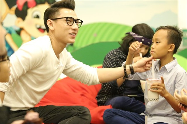 Cậu bé phấn khởi khi được giám khảo Isaac mua quà xuống thăm mình và các bạn. Ảnh: Tiến Đạt