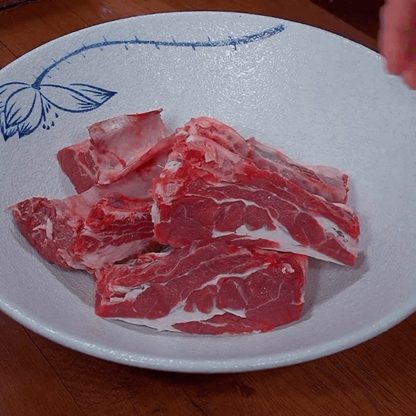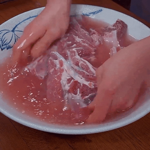 Bước 1: Cắt thịt bò thành các miếng to đều nhau. Cho vào tô, thêm 1 thìa cà phê muối. Thêm khoảng 1 lít nước, sau đó bóp rửa để cho phần máu thừa được loại bỏ.