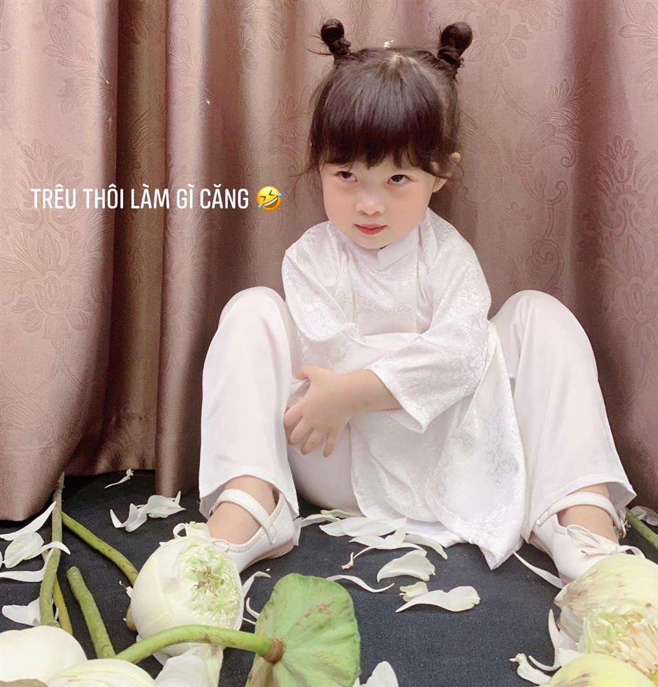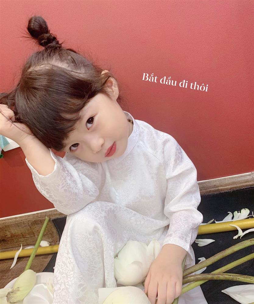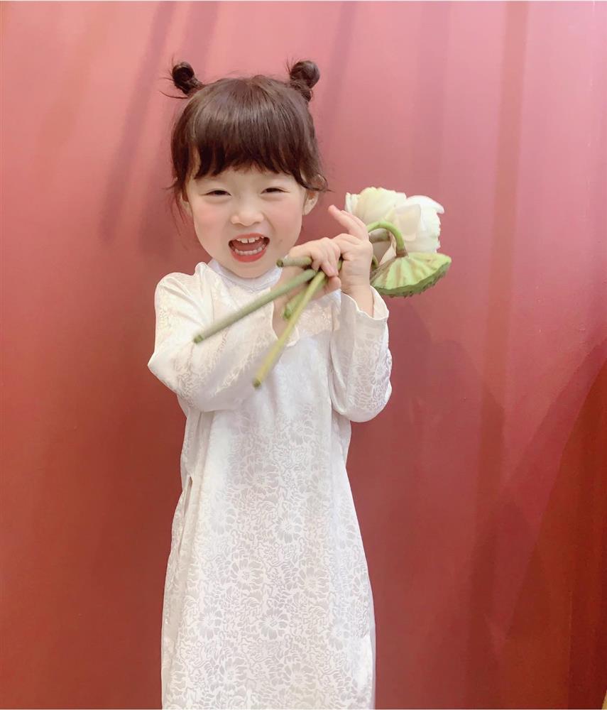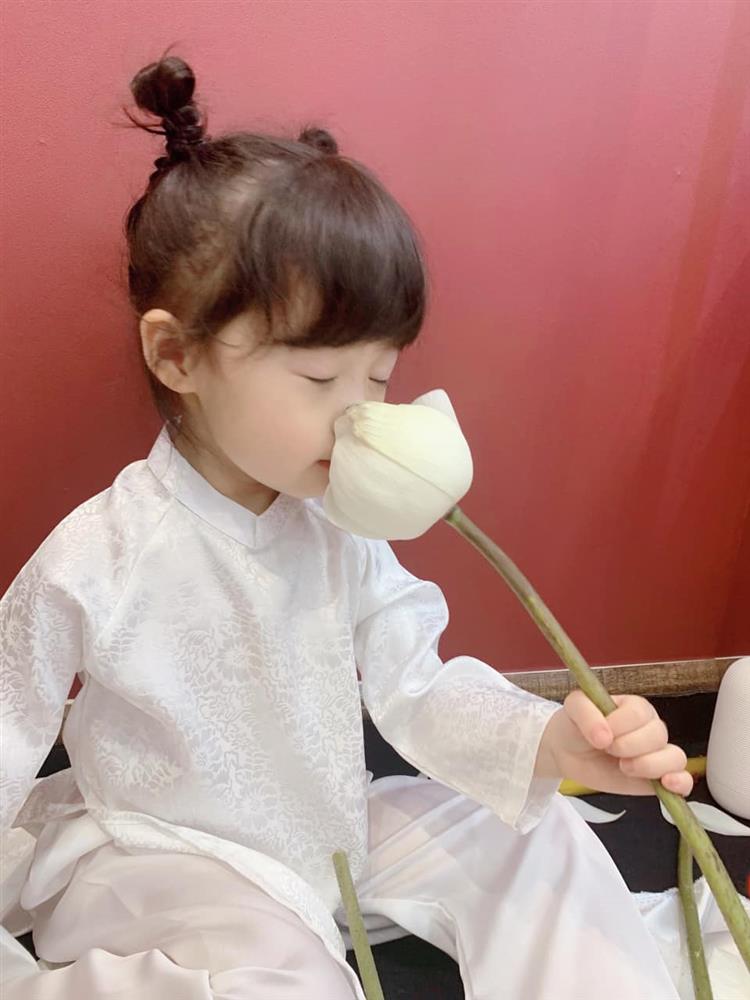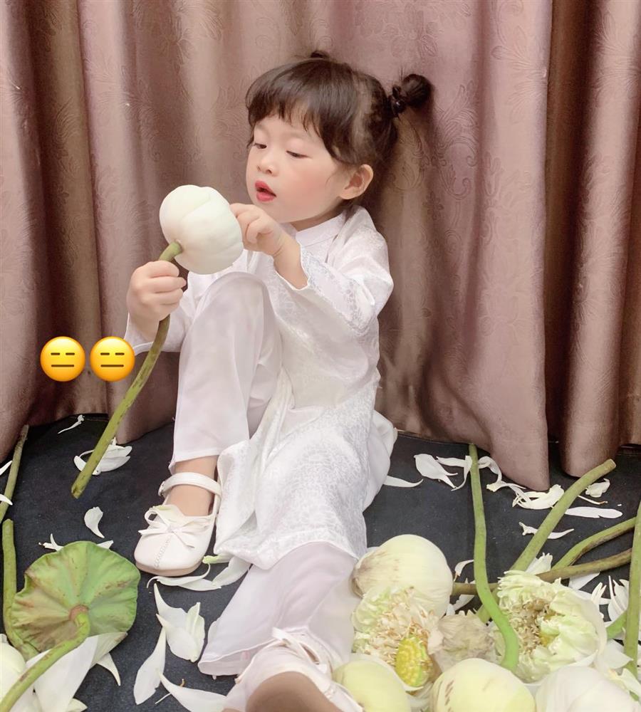 Tuy nhiên "cái khó ló cái khôn", một khi các bậc phụ huynh đã kiên quyết chụp với sen thì kiểu gì cũng có cách để thực hiện! Chị Nhữ Thảo (34 tuổi, Hà Nội) vốn không có con gái mà chỉ có 2 cậu con trai, nên chị đã năn nỉ cô cháu bé bỏng tên Bu để làm mẫu chụp sen ngay tại nhà. Không ra đầm chụp được nên chị Thảo đã "biến hóa" ra chiếc studio nhỏ xinh ngay trong nhà, diện cho Bu chiếc áo dài trắng tinh khôi, tô tí son rồi tạo dáng bên bó sen thơm nức.