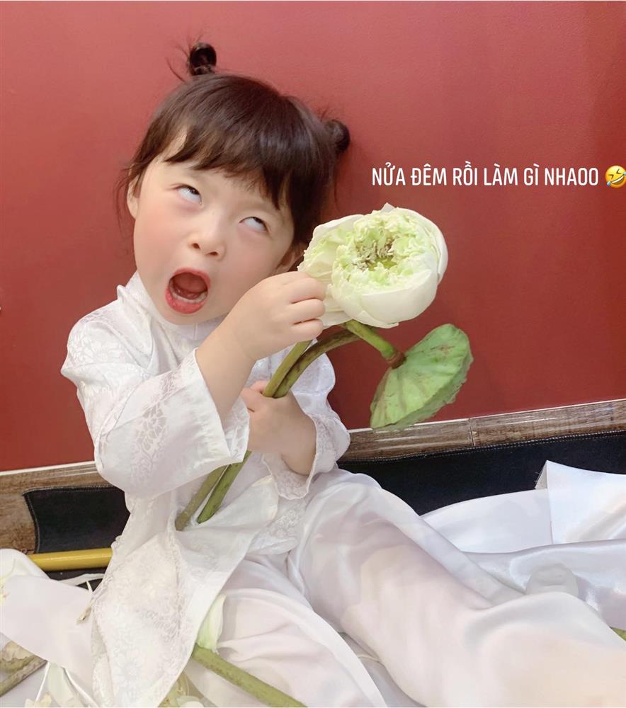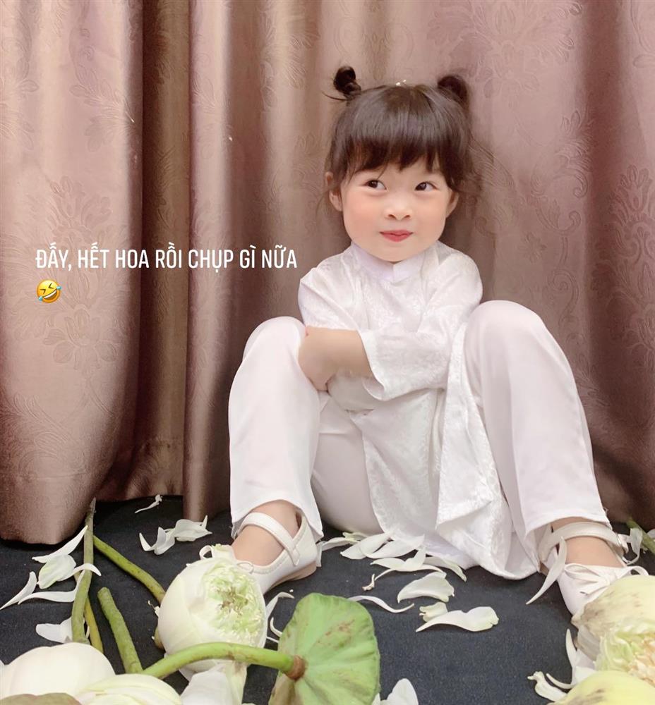 Khi mới bắt đầu chụp ảnh thì Bu khá hào hứng, cô nhóc 3 tuổi rưỡi lăn lộn khắp nơi với bó sen trong tay trông đáng yêu vô cùng. Cơ mà Bu không biết thương hoa tiếc ngọc gì cả, cô nhóc vặt rụng từng cánh hoa đến khi không còn bông sen nào nguyên vẹn, chị Nhữ Thảo cũng bó tay với cháu gái.