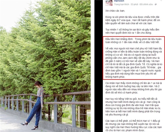 Trên trang cá nhân, nữ ca sĩ chia sẻ cụ thể về nội dung bộ phim tài liệu mang tên Hari: đứa con lai Hàn – Việt. Trong đó, Hari Won nhấn mạnh cô không hề đề cập bất cứ điều gì liên quan đến cô dâu Việt. Việc xuất hiện tranh cãi là do đoạn phỏng vấn từ nhiều năm trước và trong ngữ cảnh cũng rất khác.