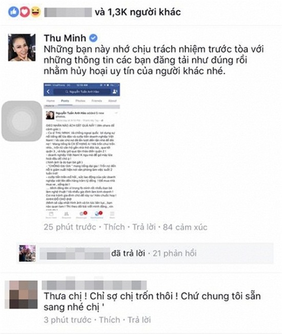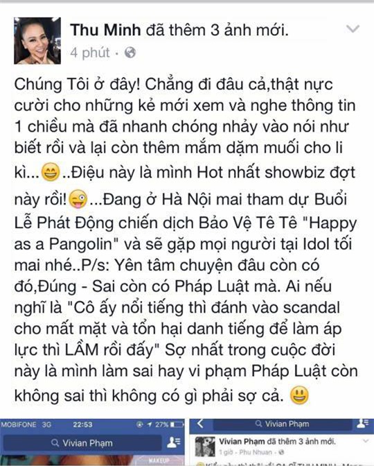 Tối ngày 28/7, một tài khoản facebook bất ngờ đăng tải một số hình ảnh và status tố Thu Minh lừa đảo và cướp tiền doanh nghiệp để mua xe, mua nhà "sống ảo".