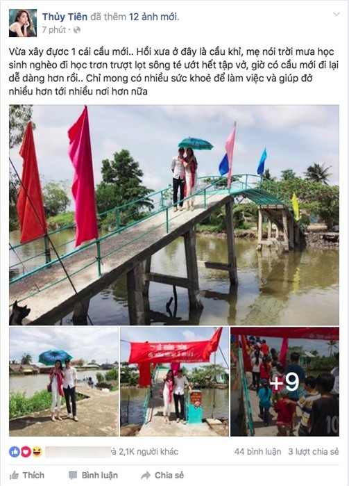 Mới đây, Thủy Tiên cùng với ông xã Công Vinh đã cùng nhau xây một chiếc cầu ở Kiên Giang để giúp các trẻ em nghèo đến trường thuận tiện hơn. Được biết, toàn bộ kinh phí xây dựng vào khoảng 100 triệu đồng. Khoản tiền trên là tiền thưởng của Công Vinh khi cùng tuyển Việt Nam vô địch giải giao hữu tứ hùng tại Myanmar, và một phần được Thuỷ Tiên góp thêm.