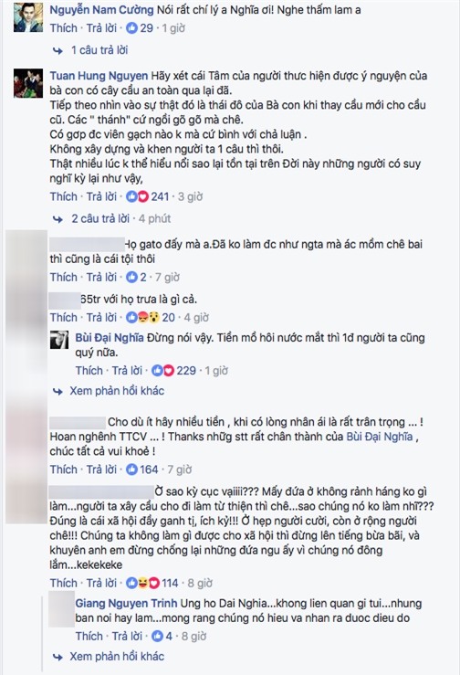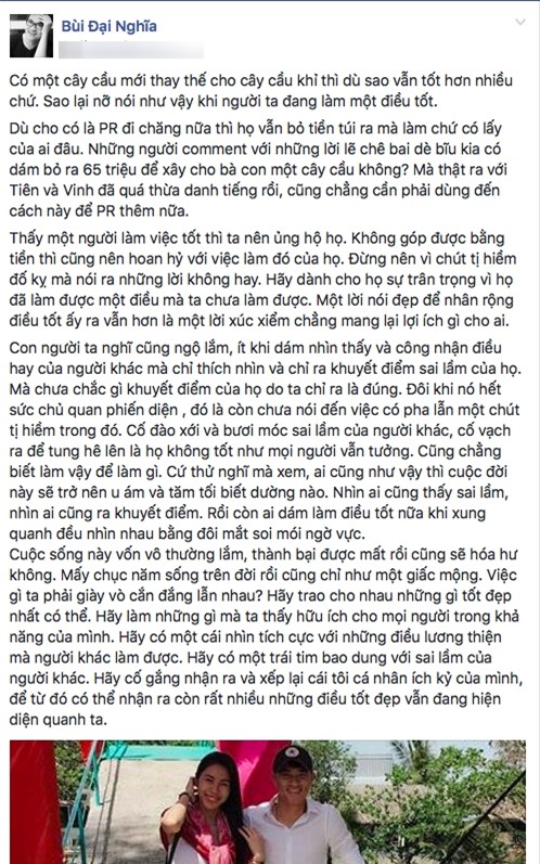 Trước những lời chê bai, bình phẩm thiếu tích cực từ một số cư dân mạng, nghệ sĩ Đại Nghĩa đã lên tiếng bảo vệ việc làm xuất phát từ tâm của hai vợ chồng Thuỷ Tiên – Công Vinh.