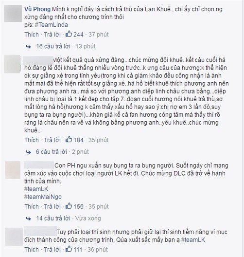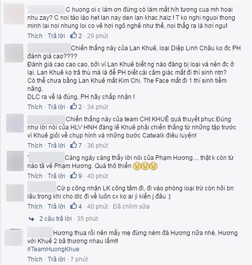 Sau bao ngày tháng, cuối cùng team Lan Khuê cũng thắng cuộc ở tập 7 The Face. Lan Khuê đã loại Diệp Linh Châu đội Phạm Hương và giữ lại Phí Phương Anh đội Hà Hồ. Hồ Ngọc Hà cảm thấy khá thuyết phục. Nhưng Phạm Hương lại bất bình cho rằng kết quả thiếu thuyết phục.