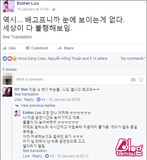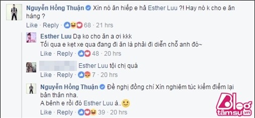 Dưới phần bình luận, nhiều người đã ghé vào hỏi thăm nữ ca sĩ, trong số đó có nhạc sĩ Nguyễn Hồng Thuận. Anh “chất vấn” cô rằng liệu có phải nguyên nhân của chuyện này là do bị Trấn Thành ăn hiếp, hay là do nam MC… không cho cô ăn hàng?