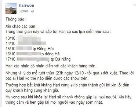Tối ngày 12/10, nữ ca sĩ bất ngờ lên cơn đau dữ dội ở bụng. Sau khi suy đoán bạn gái bị đau ruột thừa, nam MC Trấn Thành đã tức tốc đưa Hari đi cấp cứu. Kết quả khám cho biết bác sĩ chuẩn đoán Hari Won bị viêm ruột thừa nên phải mổ trong đêm.