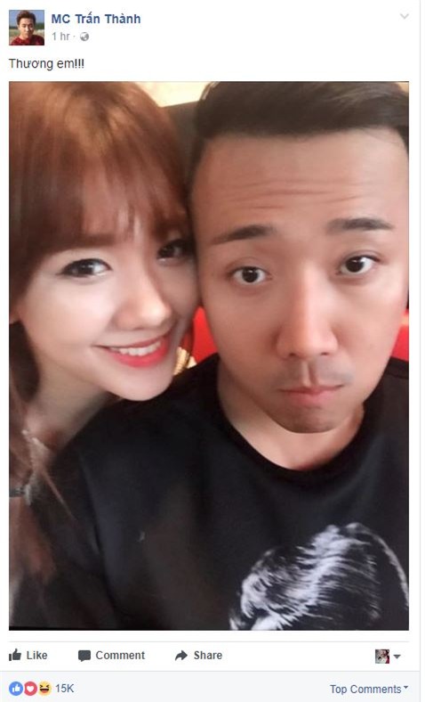 Mặc dù đang ở giữa tâm bão chỉ trích, nhưng có lẽ Hari Won sẽ ấm lòng phần nào vì chồng của mình, Trấn Thành mới đây đã đăng tải một bức ảnh tình cảm của cả hai kèm theo dòng chữ ngắn gọn: "Thương em...".