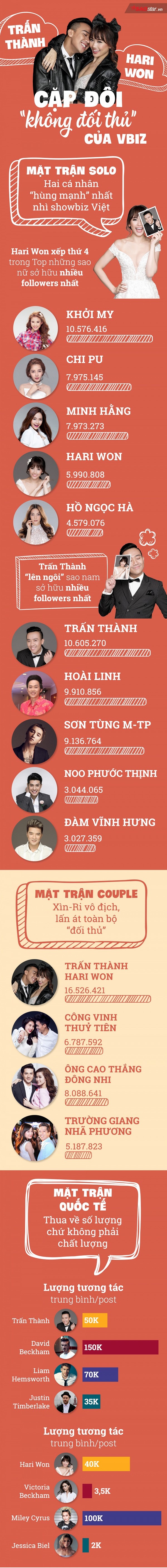 Khi so sánh trên mặt trận quốc tế, đặt Trấn Thành và Hari Won “lên bàn cân” với các “đôi câu” đình đám thế giới khác như David - Victoria Beckham, Liam Hemsworth - Miley Cyrus,… thì cặp “tiên đồng ngọc nữ” Việt Nam có lượng fan theo dõi chỉ “kém chút đỉnh”. Tuy nhiên, nếu xét về lượng tương tác thì Hari Won và Trấn Thành hoàn toàn có thể tự tin không hề thua thiệt.