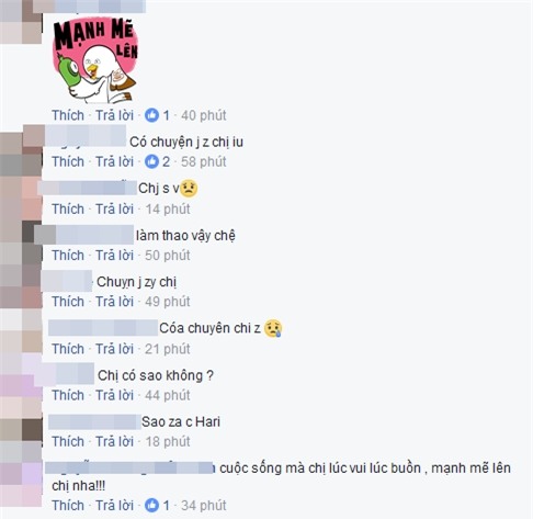 Khán giả đã vô cùng lo lắng và dành lời quan tâm hỏi thăm cho bà xã Trấn Thành. Ngoài những câu hỏi: có chuyện gì vậy chị, sao đấy em,…. thì nhiều fans nói lời động viên: Mạnh mẽ lên chị ơi! Dù có chuyện gì thì đừng ngã gục xuống! em thương chị quá à. Hay: Cố lên chị yêu, cuộc sống thì có lúc bùn và vui nhưng đừng buồn chị yêu, hãy luôn luôn nở nụ cười thì mọi chuyện sẽ trôi qua rất nhanh chóng. Yêu chị nhiều lắm. Mạnh mẽ lên nhá chị.