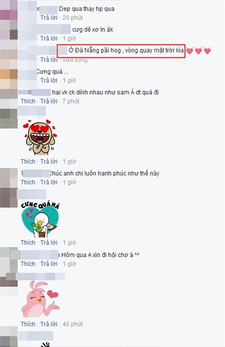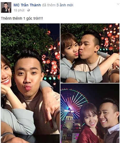 Trong khi, bà xã Hari Won đăng trạng thái đầy tâm trạng thì Trấn Thành lại ngược hoàn toàn khi khoe khoảnh khắc tinh nghịch vui vẻ của hai vợ chồng với cảm xúc đầy hào hứng: Thênh thênh một góc trời. Nếu như, bà xã Hari Won nhận được vô số lời an ủi thì Trấn Thành lại nhận mưa lời khen tung hô từ người hâm mộ. Có fan còn dự đoán đây là hình ảnh cặp đôi ghi lại ở vòng quay mặt trời tại Đà Nẵng.
