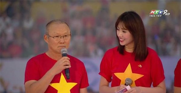 Hari Won xuất hiện trên sân khấu cùng với HLV Park Hang-seo.