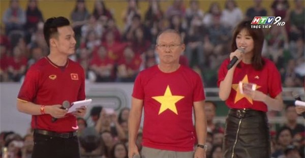 Trước phần giao lưu với các tuyển thủ, vị HLV đáng kính Park Hang-seo được vinh danh trên sân khấu. Trước hàng ngàn cổ động viên, ông đã có những chia sẻ rất chân thành về các cầu thủ của mình cũng như sự yêu mến của người hâm mộ Việt Nam dành cho ông. Và người giúp HLV Park chuyển tải những chia sẻ này đến với người hâm mộ Việt Nam là nữ ca sĩ Hari Won.