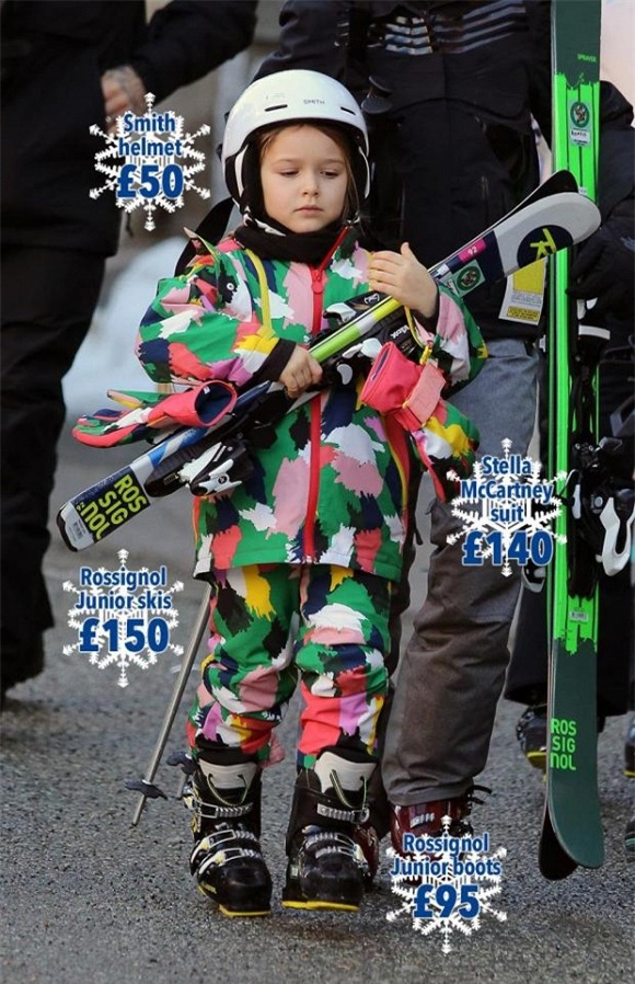 Riêng công chúa nhỏ Harper mặc đồ sặc sỡ nổi bật nhất. Cô bé diện đồ thương hiệu Stella McCartney có giá 140 bảng Anh (gần 4 triệu đồng), giày trượt tuyết Rossignol giá 95 bảng Anh (gần 2,7 triệu đồng), nón bảo hiểm Smith giá 50 bảng Anh (khoảng 1,4 triệu đồng) và ván trượt tuyết Rossignol giá 150 bảng Anh (khoảng 4,2 triệu đồng).