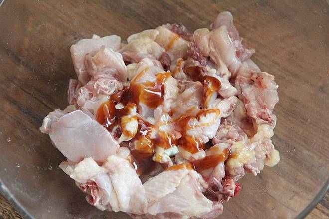 Thịt gà rửa sạch, chặt thành từng miếng vừa ăn, ướp nhẹ với rượu nấu ăn, hạt tiêu và dầu hào.