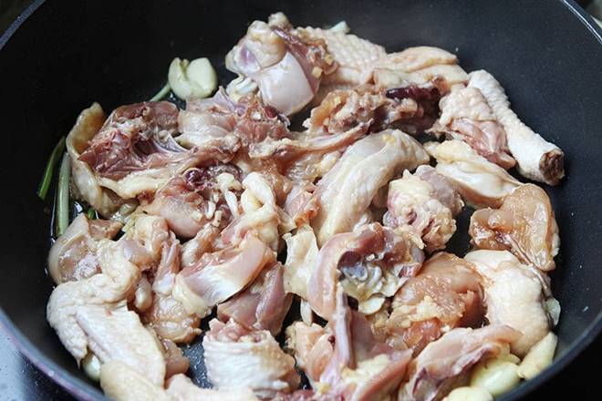 Xào cho đến khi bề mặt miếng gà có màu vàng nâu. Khi gà khô thì đổ nước sôi ngập các nguyên liệu. Thêm nước tương, dầu hào, hắc xì dầu và đường phèn cho vừa ăn. Thích cay có thể cho thêm ít ớt khô, đậy nắp đun đến khi nước sôi thì vặn lửa vừa và nhỏ đun khoảng 30 phút, cuối cùng vặn lửa lớn để nước cạn bớt là xong.