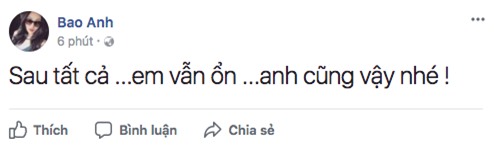 Sáng 17/10, Hồ Quang Hiếu bất ngờ đăng tải chia sẻ khá dài tiết lộ việc anh và Bảo Anh đã đường ai nấy đi với lý do không còn đồng điệu về quan niệm sống. Trước sự quan tâm từ phía dư luận, giọng ca "Anh muốn em sống sao" đã khoá tài khoản Facebook cá nhân của mình. Tuy nhiên mới đây, Bảo Anh đã trở lại mạng xã hội và gây chú ý với chia sẻ: "Sau tất cả... em vẫn ổn... anh cũng vậy nhé!". Dù không trực tiếp ám chỉ ai nhưng đông đảo người hâm mộ cho rằng cô đang gửi lời nhắn nhủ tới tình cũ Hồ Quang Hiếu.