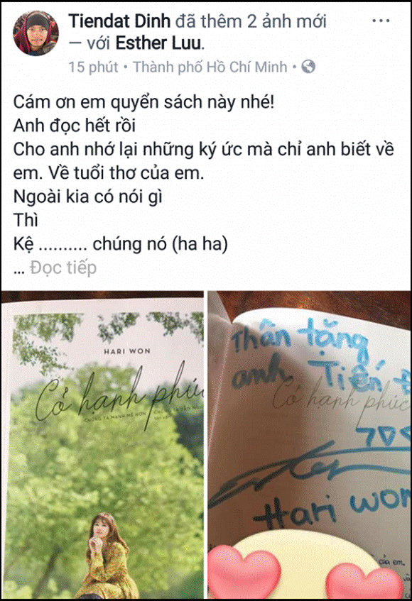 Tuy nhiên không để người cũ phải chịu đựng scandal một mình, Tiến Đạt đã lên tiếng bảo vệ Hari Won trên Facebook cá nhân. Kèm theo đó, anh đăng tải hình ảnh cuốn tự truyện do tình cũ gửi tặng. "Cám ơn em quyển sách này nhé! Anh đọc hết rồi. Cho anh nhớ lại những ký ức mà chỉ anh biết về em. Về tuổi thơ của em. Ngoài kia có nói gì thì kệ chúng nó. Không ai sống cuộc đời của mình nên cứ vậy mà sống.