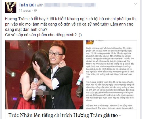 Một ngày sau đó, Bùi Anh Tuấn đã có những lời chia sẻ trên Facebook cá nhân nhằm bảo vệ tình cũ. Anh viết: "Hương Tràm có lỗi hay không tôi không biết! Nhưng người không có tội hà cớ chi phải tạo thị phi vào lúc mọi ánh mắt đang đổ dồn về cô ca sỹ nhỏ tuổi?