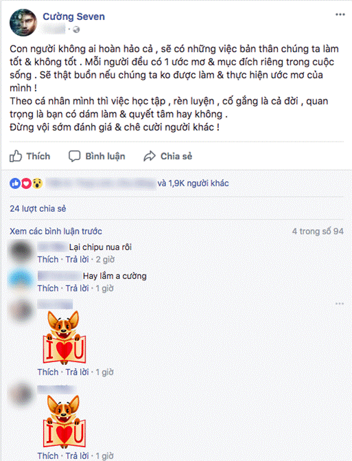Dù không nêu đích danh ai trong status này, nhưng người hâm mộ dễ dàng đoán ra đây là lời động viên âm thầm của Cường Seven cho Chi Pu. Cả hai đã có thời gian quen biết 4 năm, cho đến tháng 5/2013 "đường ai nấy đi" vì không còn phù hợp với nhau. Tuy nhiên, mối quan hệ giữa cặp đôi này không quá căng thẳng, họ thi thoảng vẫn hợp tác trong các dự án và hỗ trợ đối phương trong công việc. Động thái bênh vực, ủng hộ Chi Pu của Cường Seven được người hâm mộ đánh giá cao.