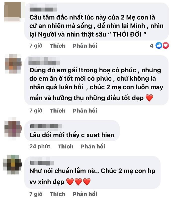 - Đúng đó em gái, trong họa có phúc, nhưng do em ăn ở tốt mới có phúc, chứ không là nhân quả luân hồi, chúc 2 mẹ con luôn may mắn và hưởng thụ những điều tốt đẹp.