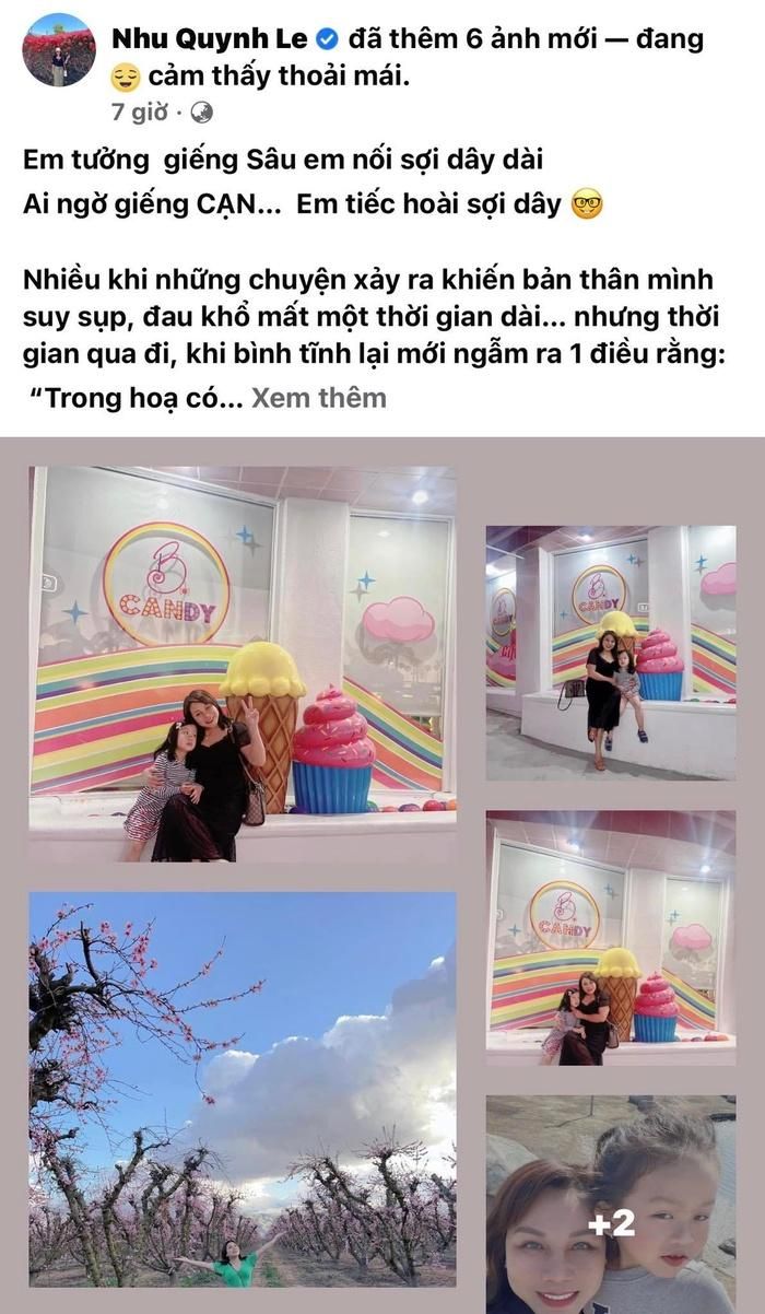 Trên trang cá nhân, hậu ly hôn Như Quỳnh đăng tải dòng trạng thái đầy tâm trạng. Cô viết: "Em tưởng giếng sâu em nối sợi dây dài. Ai ngờ giếng cạn em tiếc hoài sợi dây. Nhiều khi những chuyện xảy ra khiến bản thân mình suy sụp, đau khổ mất một thời gian dài nhưng thời gian qua đi, khi bình tĩnh lại mới ngẫm ra 1 điều rằng: Trong họa có phúc.