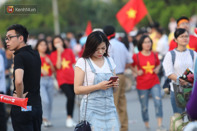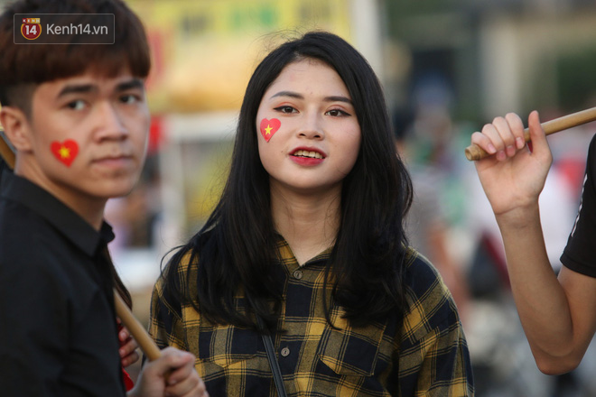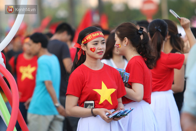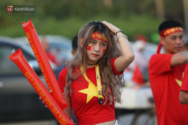 Từ khắp cả ngả đường, người hâm mộ đang ùn ùn đổ về Mỹ Đình với cờ đỏ sao vàng, băng rôn khẩu hiệu rợp trời. Mọi người từ trẻ đến già, từ trai đến gái, ai ai cũng háo hức chuẩn bị tinh thần tốt nhất để cổ vũ cho các "chiến binh áo đỏ" của đội tuyển. Và giữa không khí nóng như lửa này, người ta vẫn không quên dành sự chú ý cho các bóng hồng đến tới cổ vũ - "gia vị" giúp cho những trận cầu trở nên hấp dẫn hơn.