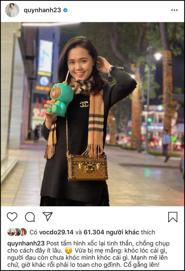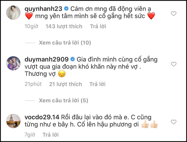 Sau khi nhận được lời động viên của Quỳnh Anh trên Instagram, Duy Mạnh đã nén đau, để lại dòng bình luận ngắn gọn nhưng đầy ý nghĩa: "Gia đình mình cùng cố gắng vượt qua gia đoạn khó khăn này nhé vợ. Thương vợ".