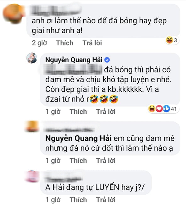 Tối 14/4, Quang Hải tham dự một buổi giao lưu trực tuyến với người hâm mộ. Tại đây anh nhận được những câu hỏi khá thú vị. Khi có fan nói đùa: "Làm sao để vừa đá bóng giỏi lại vừa đẹp trai như anh?", Quang Hải thể hiện khả năng "tự luyến" của mình khiến tất cả phải bật cười: "Đá bóng thì phải có đam mê và chịu khó tập luyện em nhé. Còn đẹp trai thì anh không biết vì anh đẹp trai từ bé rồi".