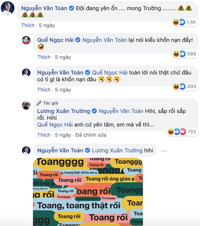 "Hello Xuân Trường. Anh dạo này khoẻ không? Đã cách ly đủ 14 ngày chưa? Bị lôi lên phường chưa? Chúc anh mau nhanh khỏi để trở lại HAGL. Đội đang yên ổn đừng về. HAGL không nhớ anh", Văn Toàn và Văn Thanh mỗi người một câu để "cà khịa" Xuân Trường cực mạnh.