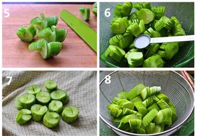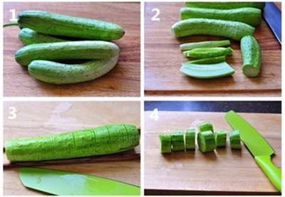 ![]() | ![]() Dưa chuột mua về rửa sạch sau đó cắt thành từng sọc nhuyễn như hình rồi cắt thành từng khoanh tầm 2-3cm. Các bạn có thể đơn giản cắt như ở hình số 2, nhưng như thế thì gia vị sẽ không thấm đều vào từng miếng dưa. Hoặc bạn khía vòng tròn khắp quả dưa chuột nhưng lưu ý không cắt đứt hoàn toàn. Sau đó cắt thành từng miếng tròn nhỏ có độ dày chừng 1-1,5cm. Làm như thế món dưa chuột ngâm chua cay sẽ thấm gia vị hơn và ngon hơn. |