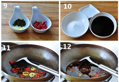 ![]() | ![]() Bắc chảo dầu lên bếp, khi dầu nóng đều thì lập tức cho rượu vang trắng vào, tiếp đến cho hạt tiêu, gừng cắt lát, tỏi cắt lát, rễ rau ngò, nước tương, muối, đường vào đảo thật nhanh tay. |