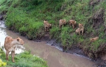 Nếu sư tử con không lên được, bố mẹ nó cũng sẽ không cứu, chỉ đứng ở xa quan sát, tới khi sư tử con sức cùng lực kiệt thì chúng mới ra tay.