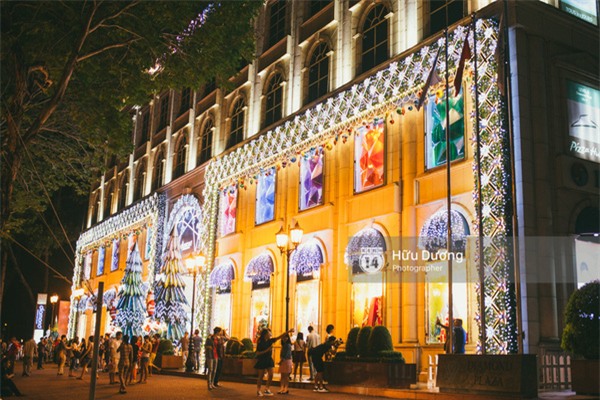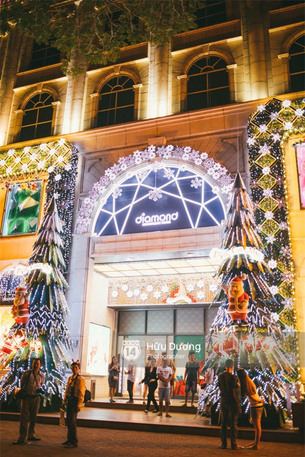 Diamond Plaza luôn là tòa nhà được trang trí đầu tiên tại Sài Gòn vào dịp Giáng Sinh hoặc Năm mới.Năm nay, khu trung tâm mua sắm này vẫn theo kiểu thiết kế đơn giản, chủ yếu là viền đèn ở các cạnh và điểm nhấn là hai cây thông Noel lớn đặt ngay cửa ra vào của tòa nhà. Cách trang trí không quá cầu kỳ nhưng sang trọng, thể hiện được tinh thần Noel ấm áp, vui tươi.