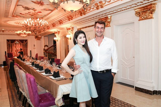 Cô diện chiếc đầm hiệu Dice Kayek màu xanh bạc hà trang nhã. Trước khi dùng cơm, cả hai đã tranh thủ lưu lại khoảnh khắc gặp mặt trong không gian phòng ăn xa hoa, lộng lẫy.