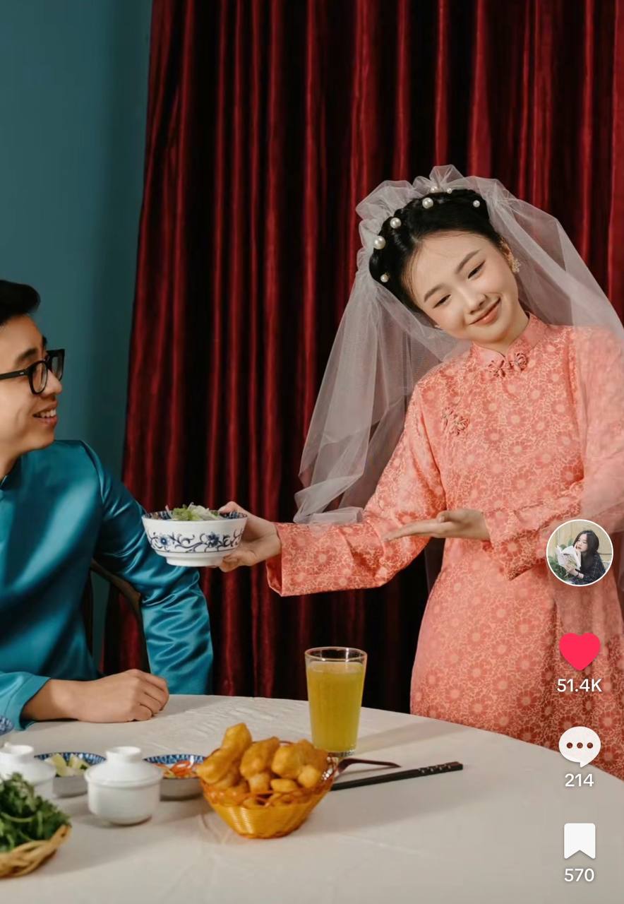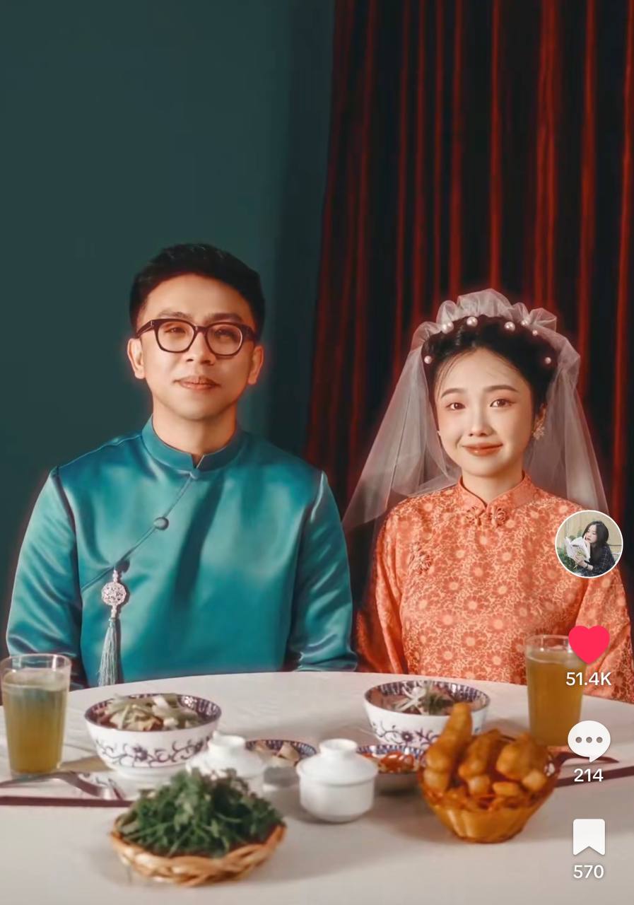 Ở đoạn clip mới nhất đăng trên trang cá nhân, cô dâu Mi Đặng gây chú ý khi hé lộ những bức hình cưới đặc biệt. Trong khi chú rể diện áo dài màu xanh thì cô dâu khoác lên mình chiếc áo dài với họa tiết cổ điển, đầu đội voan trắng.
