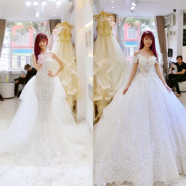 Bộ váy còn thiết kế thêm thêm một đuôi rời để cô dâu Khởi My lắp vào mặc được 2 kiểu.