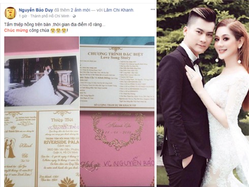 Trên trang cá nhân của Bảo Duy - chồng cũ Phi Thanh Vân đăng tải những hình ảnh về tấm thiệp mời của Lâm Khánh Chi và chồng trẻ.
