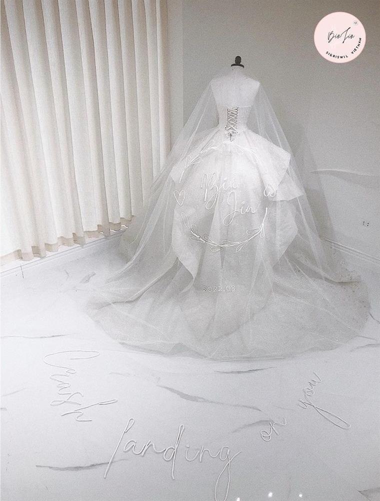 Trong lúc chờ đợi tới hôn lễ, fan Việt Nam đã chuẩn bị món quà vô cùng đặc biệt tặng cho cặp đôi thần tượng nhân ngày trọng đại. Đó là một chiếc khăn voan cưới có thêu những dòng chữ vô cùng đặc biệt: "Bin Jin - 3.2022 Crash Landing On You".