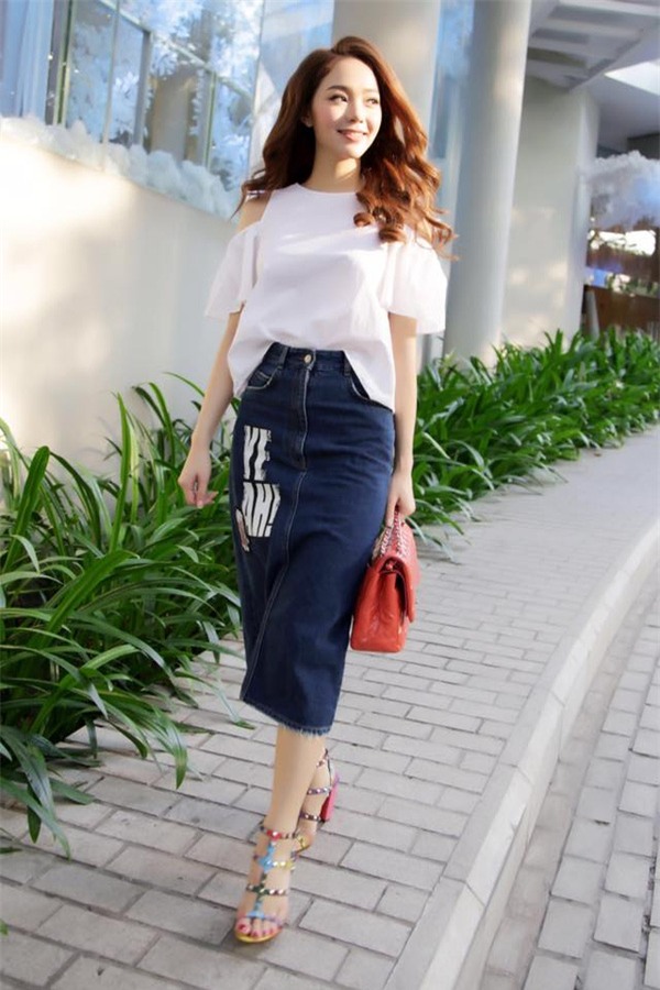 Minh Hằng duyên dáng xuống phố với áo khoét vai kết hợp cùng chân váy denim dáng midi.