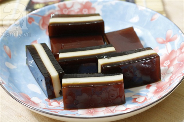 Khi các lớp thạch đã đổ xong, bạn để nguội rồi đem cất ngăn mát tủ lạnh vài tiếng cho thạch lạnh và đông lại, khi ăn lấy ra cắt miếng vừa ăn ch ra đĩa để thưởng thức.