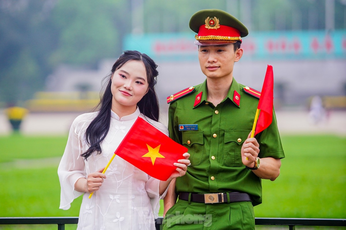 Ngọc Giàu (quận Gò Vấp) vui vẻ cùng bạn bè lưu giữ những khoảnh khắc kỷ niệm. Cô chia sẻ: "Ngoài những bức ảnh với lá cờ đỏ sao vàng, các phụ kiện mang hình ảnh Việt Nam còn giúp lan tỏa tinh thần kết nối của thế hệ trẻ với lịch sử theo một cách gần gũi và hiện đại hơn.