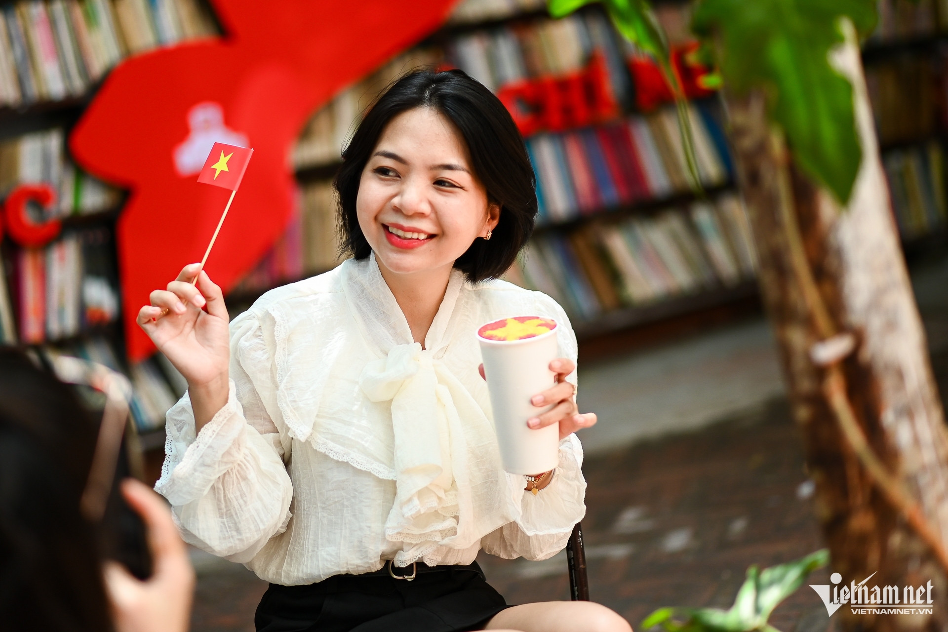 Đặc biệt, chủ quán cà phê tại đây còn treo hình bản đồ Việt Nam cao hơn 2m trong không gian quán, thu hút các bạn trẻ muốn check-in cùng. Theo nhân viên quán, việc trang trí cờ đỏ sao vàng và bản đồ Việt Nam không chỉ tạo không gian đẹp mà còn khơi gợi tinh thần tự hào dân tộc.