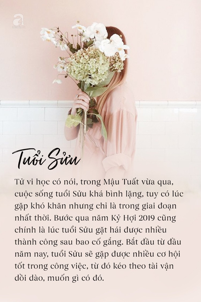 Trời sinh tuổi Sửu là những người siêng năng, chăm chỉ, luôn lấy công việc ra làm niềm vui. Tuổi Sửu tâm niệm, cuộc sống sướng khổ đều nằm trong long bàn tay của mình, nếu như không ngừng nỗ lực cố gắng thì sẽ không thể thành công. Tuổi Sửu không quá tham vọng trong cuộc sống, nhưng họ biết rằng nếu họ chăm chỉ thì họ sẽ được hưởng thụ những thành quả đó. Tử vi học có nói, trong Mậu Tuất vừa qua, cuộc sống tuổi Sửu khá bình lặng, tuy có lúc gặp khó khăn nhưng chỉ là trong giai đoạn nhất thời. Bước qua năm Kỷ Hợi 2019 cũng chính là lúc tuổi Sửu gặt hái được nhiều thành công sau bao cố gắng. Bắt đầu từ đầu năm nay, tuổi Sửu sẽ gặp được nhiều cơ hội tốt trong công việc, từ đó kéo theo tài vận dồi dào, muốn gì có đó. Đặc biệt đối với những người kinh doanh, làm ăn, đây là giai đoạn tốt để đầu tư phát triển, chắc chắn sẽ thu được lợi nhuận khổng lồ. Chờ xem nhé!