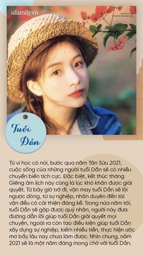 Tử vi học có nói, bước qua năm Tân Sửu 2021, cuộc sống của những người tuổi Dần sẽ có nhiều chuyển biến tích cực. Đặc biệt, kết thúc tháng Giêng âm lịch này cũng là lúc khó khăn được giải quyết. Từ bây giờ trở đi, vận may tuổi Dần sẽ lội ngược dòng, từ sự nghiệp, nhân duyên đến tài vận đều có cải thiện đáng kể. Trong nửa năm tới, tuổi Dần sẽ gặp được quý nhân, người này đưa đường dẫn lối giúp tuổi Dần giải quyết mọi chuyện, ngoài ra còn tạo điều kiện giúp tuổi Dần xây dựng sự nghiệp, kiếm nhiều tiền, thực hiện ước mơ bấy lâu nay chưa làm được. Nhìn chung, năm 2021 sẽ là một năm đáng mong chờ với tuổi Dần.
