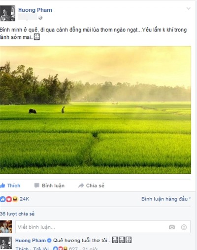 Những ngày qua, nàng Hoa hậu liên tục có những chia sẻ chất chứa nỗi niềm nhớ quê hương, trong đó có hình ảnh cánh đồng quê yên bình cùng lời bộc bạch: Bình minh ở quê, đi qua cánh đồng mùi lúa thơm ngào ngạt...Yêu lắm không khí trong lành sớm mai.....là nhận được nhiều sự quan tâm nhất.