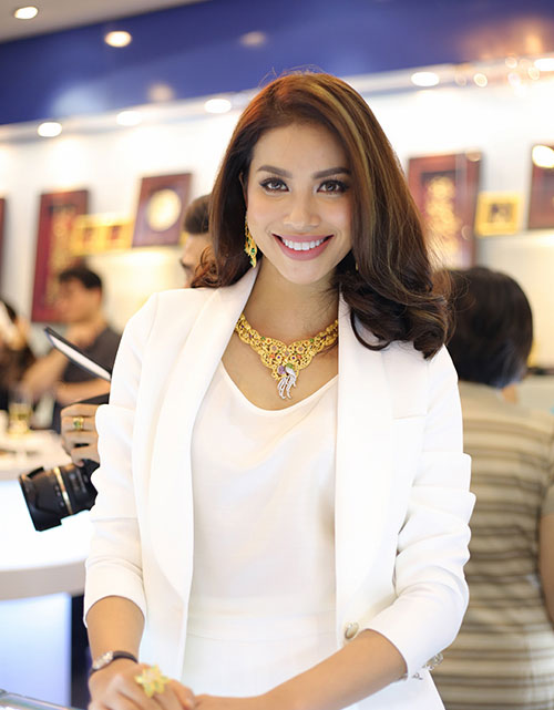Xuất hiện tại sự kiện, người đẹp đeo bộ trang sức bằng vàng, gồm dây chuyền, hoa tai và nhẫn để giúp mình thêm nổi bật. Bộ trang sức có giá trị khoảng 1 tỷ đồng.